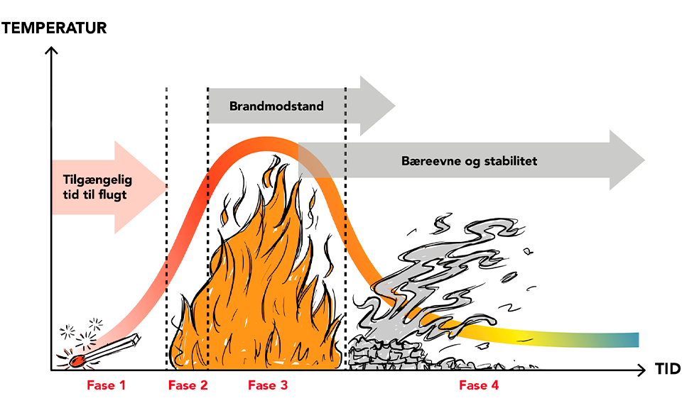 Et brandforløb har normalt 4 faser: Antænding, vækst, udvikling og afkøling.