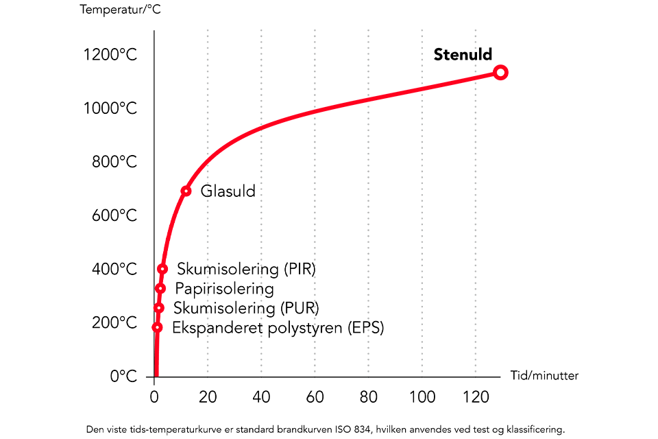 Nedenstående kurve viser forskellige isoleringsmaterialers brandmodstand i forhold til tid og temperatur. Tids-temperaturkurven er standardbrandkurven ISO 834, hvilken anvendes ved test og klassificering.
