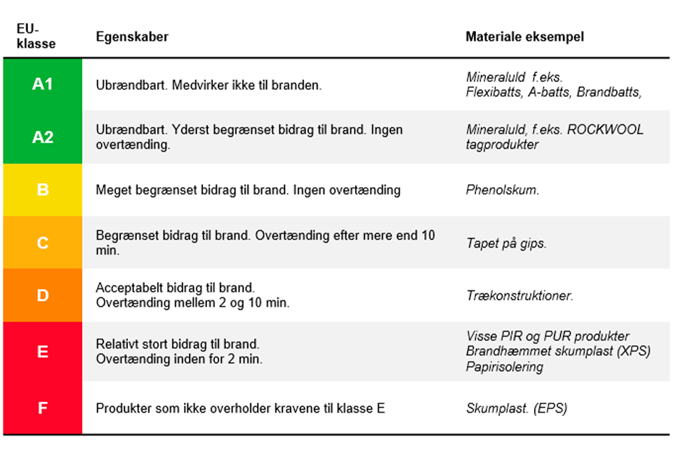 Nedenfor kan du se en oversigt over de forskellige brandklasser, reaktion på brand og eksempler på materialer.
