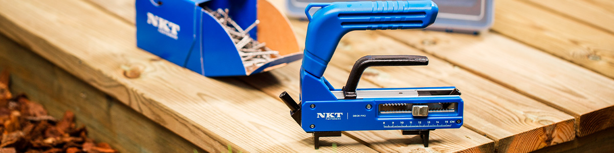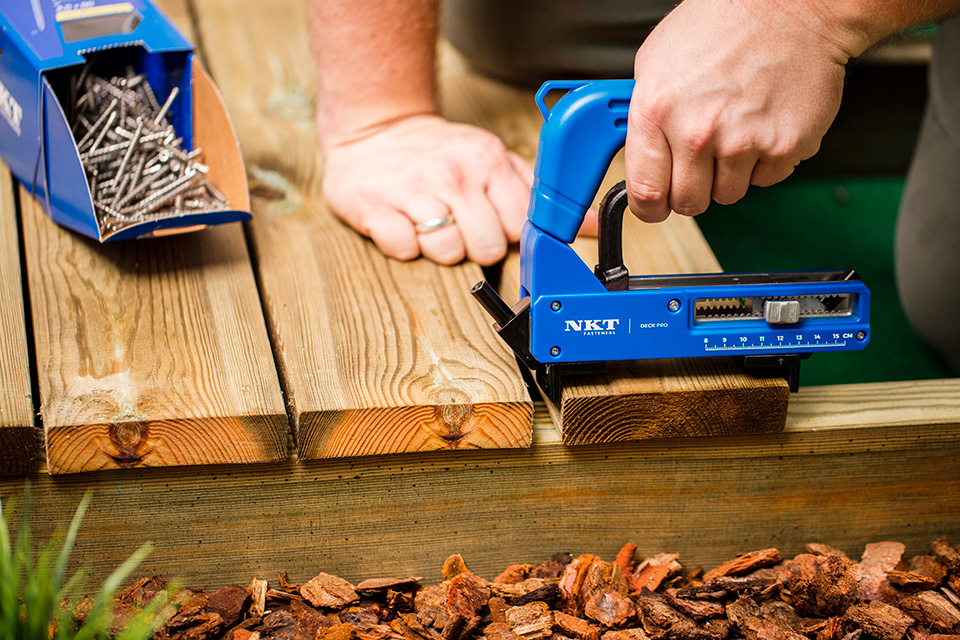 Med et Deck Pro® montageværktøj fra NKT Fasteners behøver du kun ét terrasse-værktøj, uanset bræddebredden. Juster nemt afstanden mellem brædderne med de medfølgende afstandsstykker.