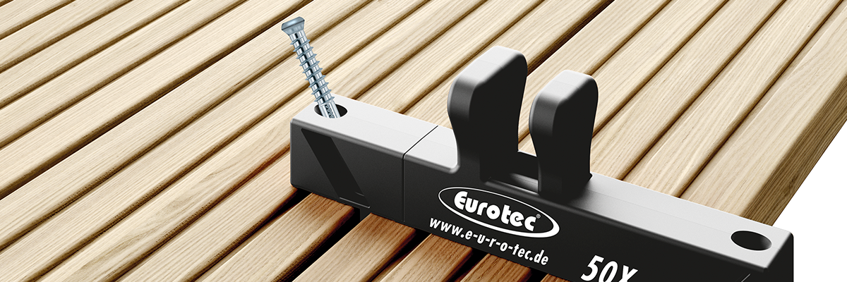 Med Eurotec 50X kan du montere terrassebrædderne uden nogen synlige skruehoveder på terrassens overflade. Skruerne bliver skruet jævnt ind med en vinkel på 50 grader på grund af de angivne fastgørelsespunkter. Den sikrer desuden en ensartet afstand på 6 mm mellem de enkelte brædder.