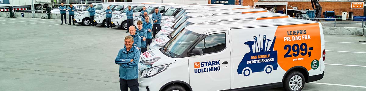 Vi har udvidet vores udvalg, så der nu er 10 varebiler til rådighed. Disse varebiler er fuldt udstyret med værktøj og kan lejes fra STARKs forretninger på Frederiksberg, i Glostrup og i Københavns Sydhavn.