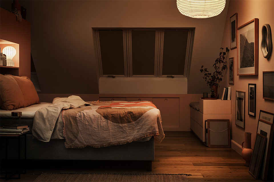 VELUX Gardiner og Solafskærmning kan hjælpe dig med at regulere lysniveauet, så det passer til dit behov. Det klassiske VELUX Mørklægningsgardin, der fås med solcelledrevet, elektrisk eller manuel betjening, er det oplagte valg til dit soveværelse, når du ønsker at sove godt og mørkt i de sene, lyse sommeraftener eller om morgenen, når solen står op før dig.