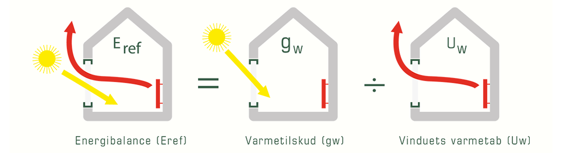 Vinduets energibalance (E-ref): Når et vindue lukker mere varme ind i huset (gw), end det lukker ud (Uw), har det en positiv E-ref-værdi. Dvs. at vinduet giver et decideret energitilskud til boligens opvarmning.