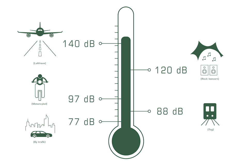 Lyd måles i decibel, som forkortes dB. 0 dB er den svageste lyd, man kan høre, når hørelsen er normal. Smertegrænsen med risiko for høreskader er 120-130 dB.
