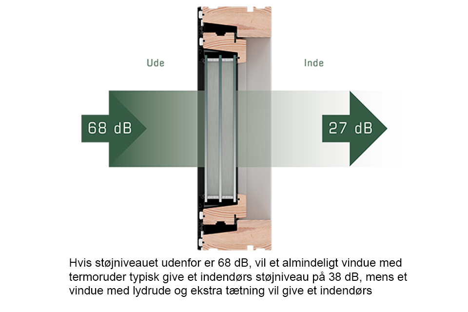Hvis støjniveauet udenfor er 68 dB, vil et almindeligt vindue med termoruder typisk give et indendørs støjniveau på 38 dB, mens et vindue med lydrude og ekstra tætning (f.eks. Rationel Auraplus træ/alu, 3-lags med udvidet lyddæmpning) vil give dig et indendørs støjniveau på 27 dB.