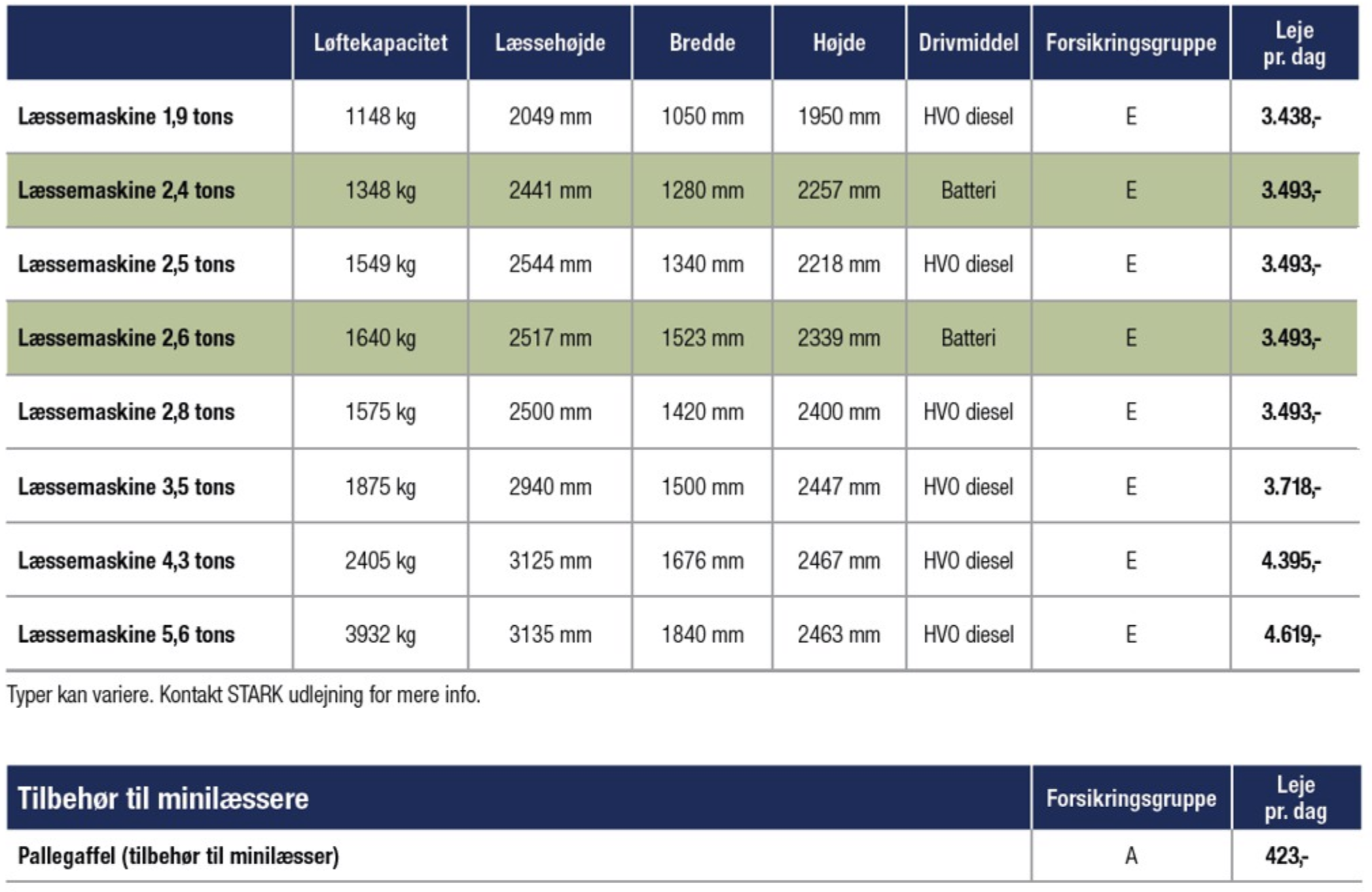 Find din lokale STARKMinilæsseren er en lille, kompakt maskine, som er manøvredygtig på byggepladser med begrænset plads. Hertil kan du leje en pallegaffel til læsseren, hvis du har behov for at få flyttet større materialer på byggepladsen. Læsseren har en begrænset løftehøjde, hvor vores udvalg spænder fra 2.049 mm til 3.135 mm, med løftekapacitet mellem 1.148 kg til 3.932 kg.