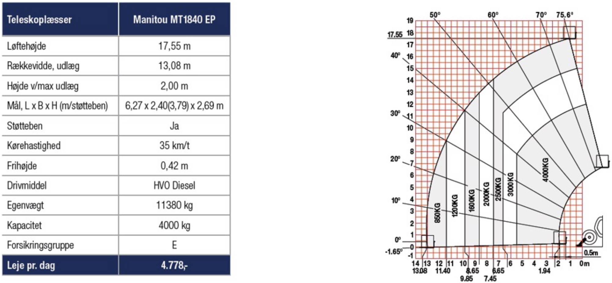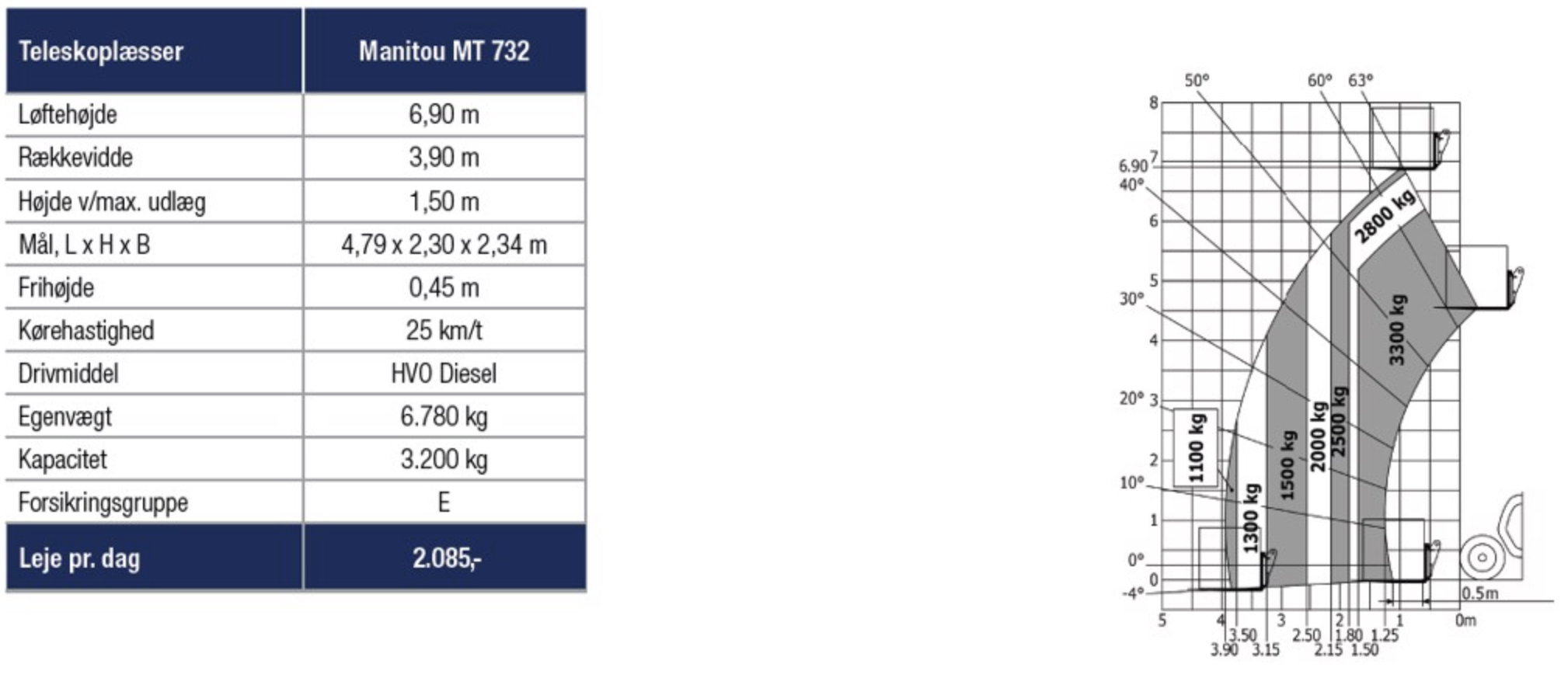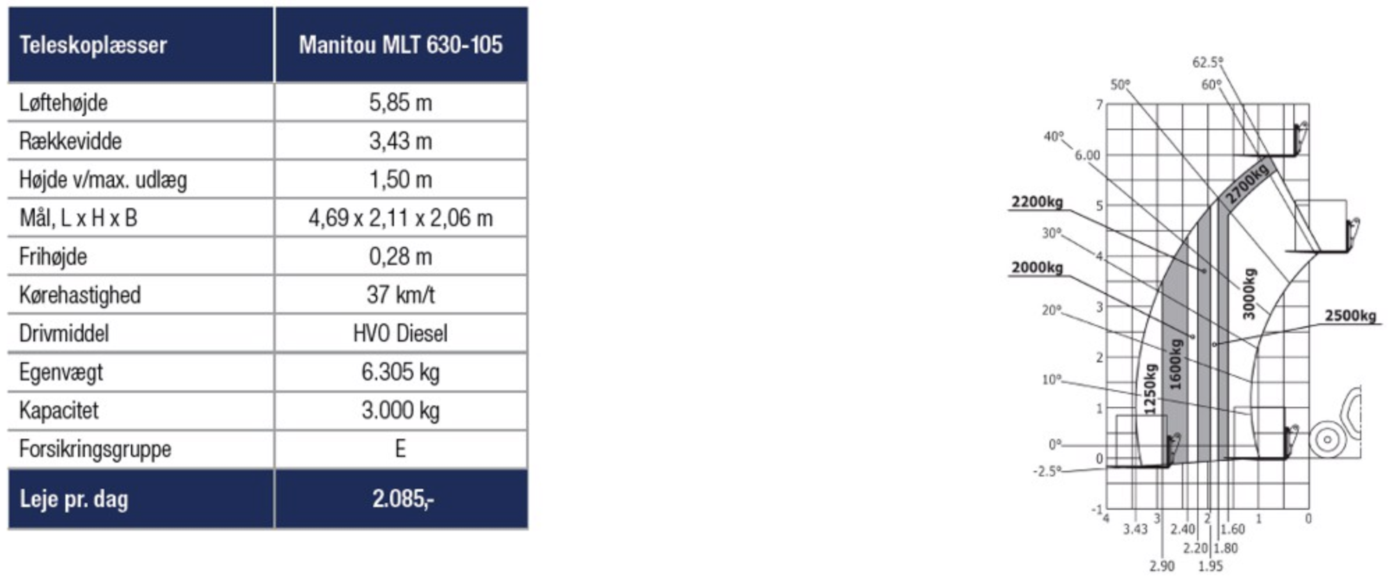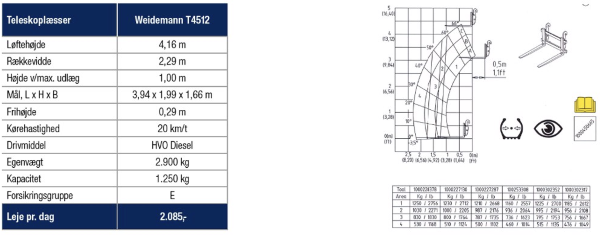 Teleskoplæsseren er større og mere kraftfuld end minilæsseren, og kan med sin teleskoparm forlænges både frem og op. Teleskoplæsseren kan løfte materialer flere meter op eller frem, alt efter dit behov. Vi udlejer teleskoplæssere med en løftehøjde mellem 4,16 m og 17,55 m, og rækkevidde mellem 2,29 m til 13,08 m. De største maskiner, som vi har, kan løfte op til 4.000 kg.