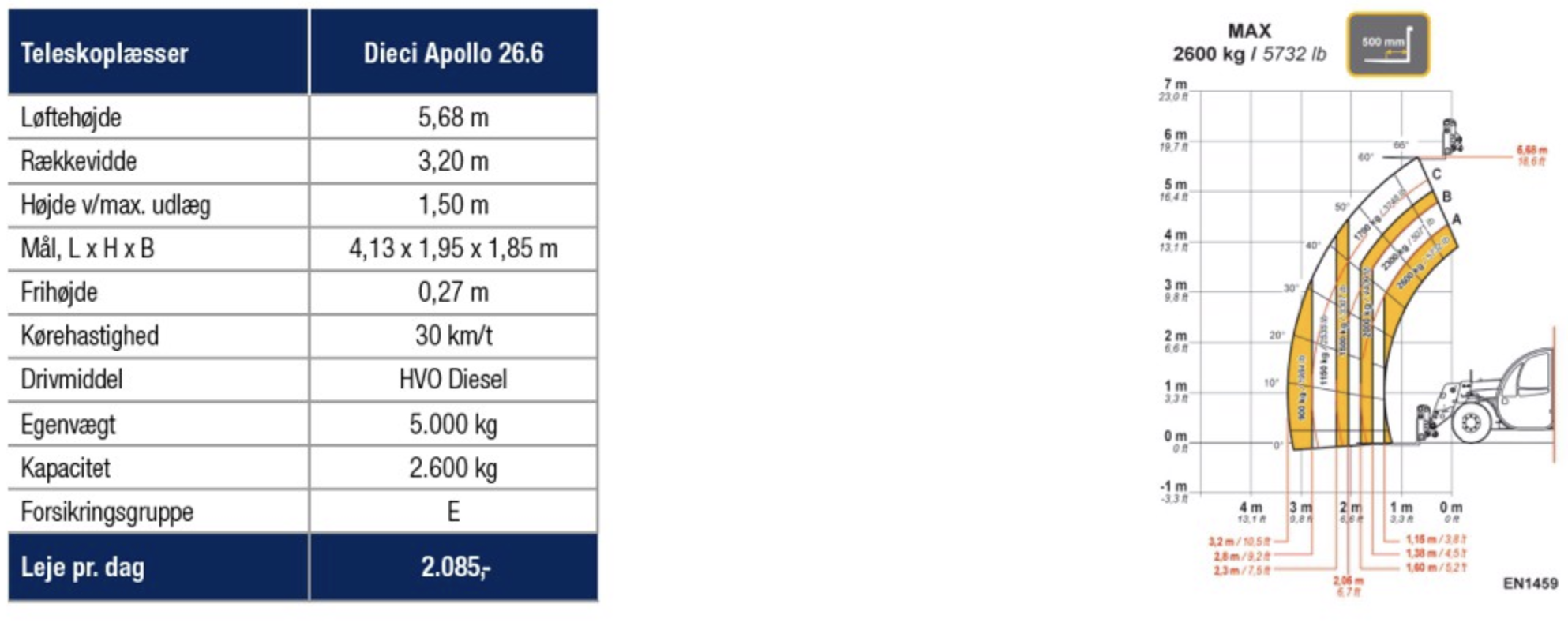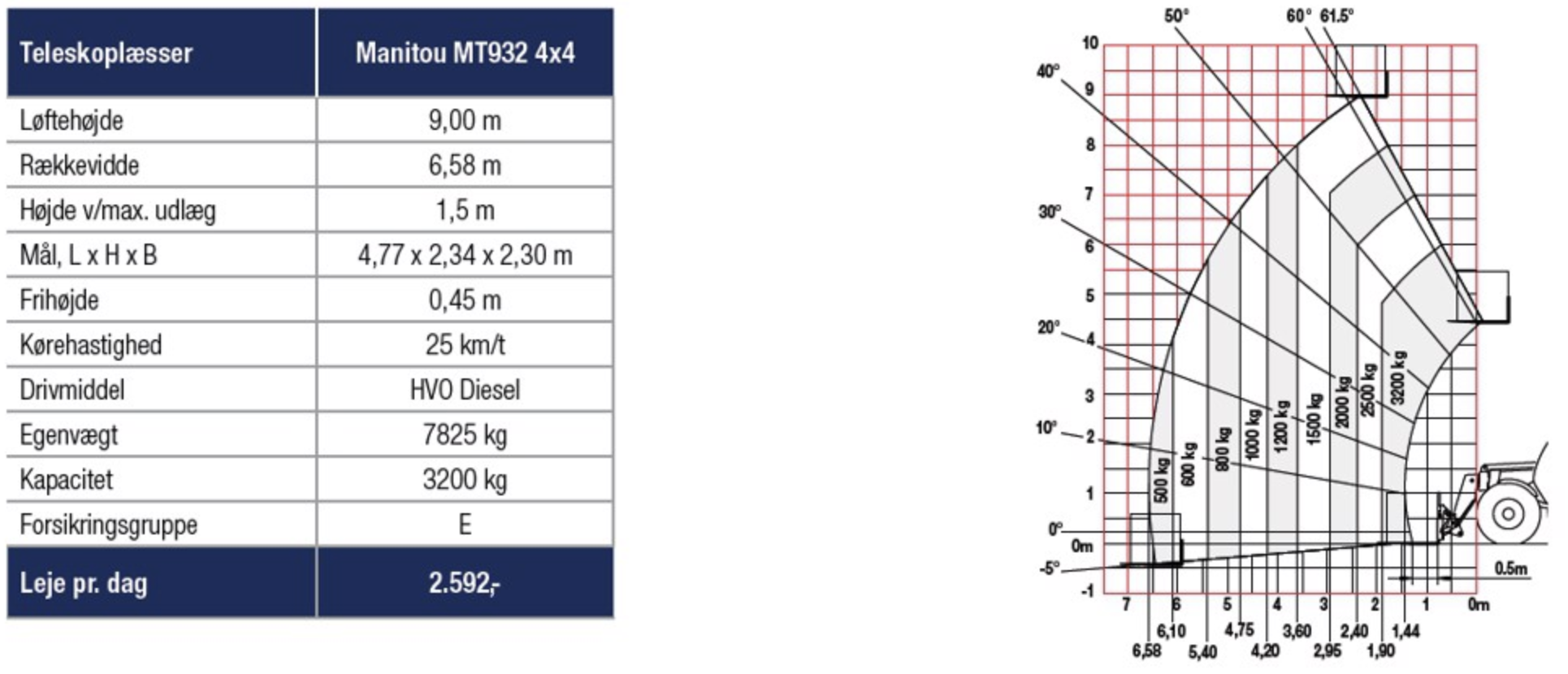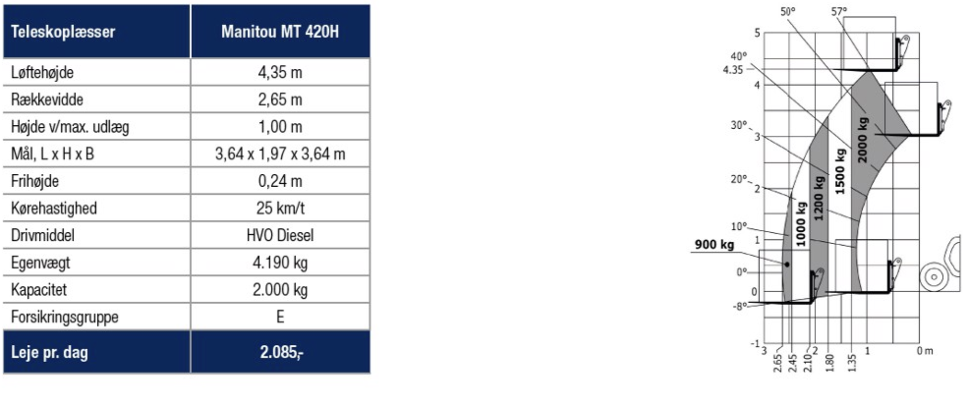 Teleskoplæsseren er større og mere kraftfuld end minilæsseren, og kan med sin teleskoparm forlænges både frem og op. Teleskoplæsseren kan løfte materialer flere meter op eller frem, alt efter dit behov. Vi udlejer teleskoplæssere med en løftehøjde mellem 4,16 m og 17,55 m, og rækkevidde mellem 2,29 m til 13,08 m. De største maskiner, som vi har, kan løfte op til 4.000 kg.