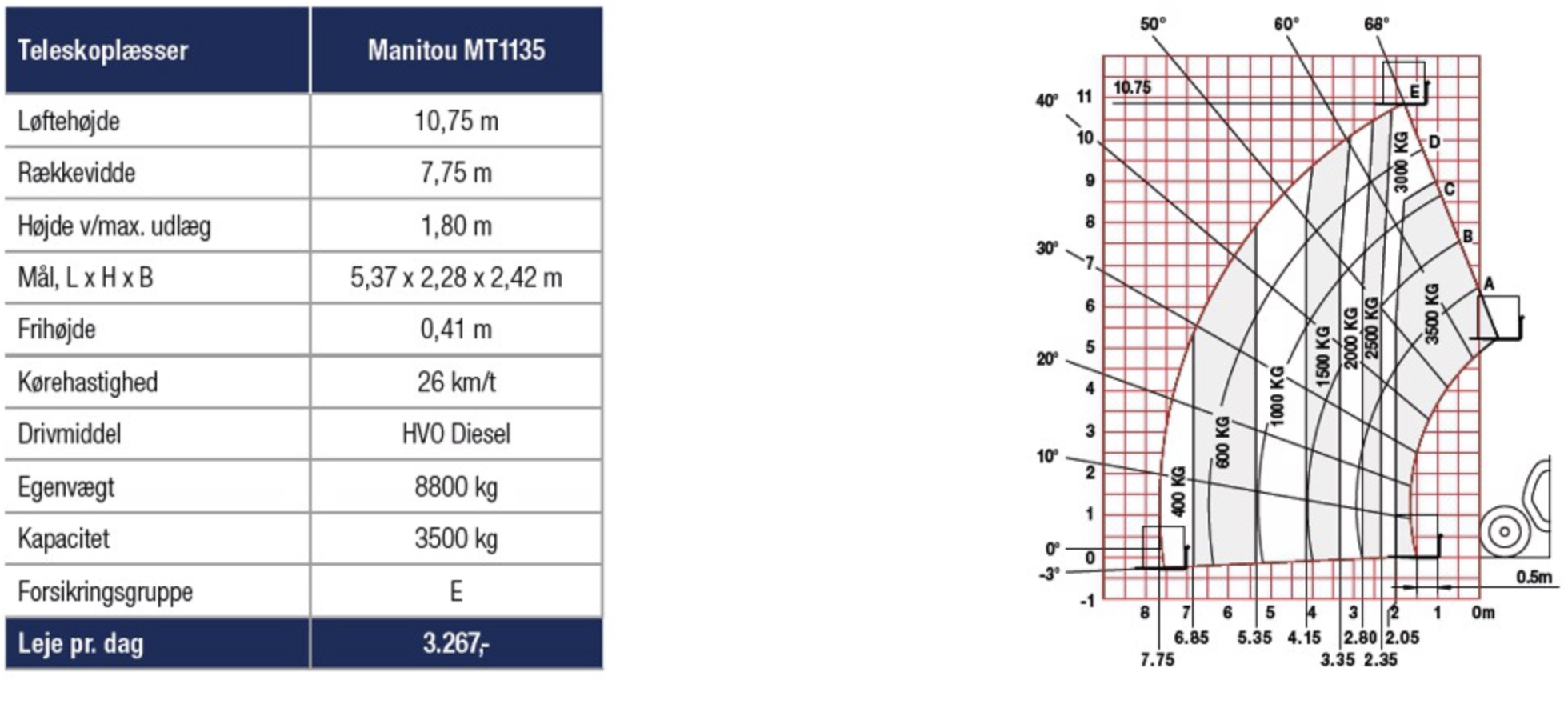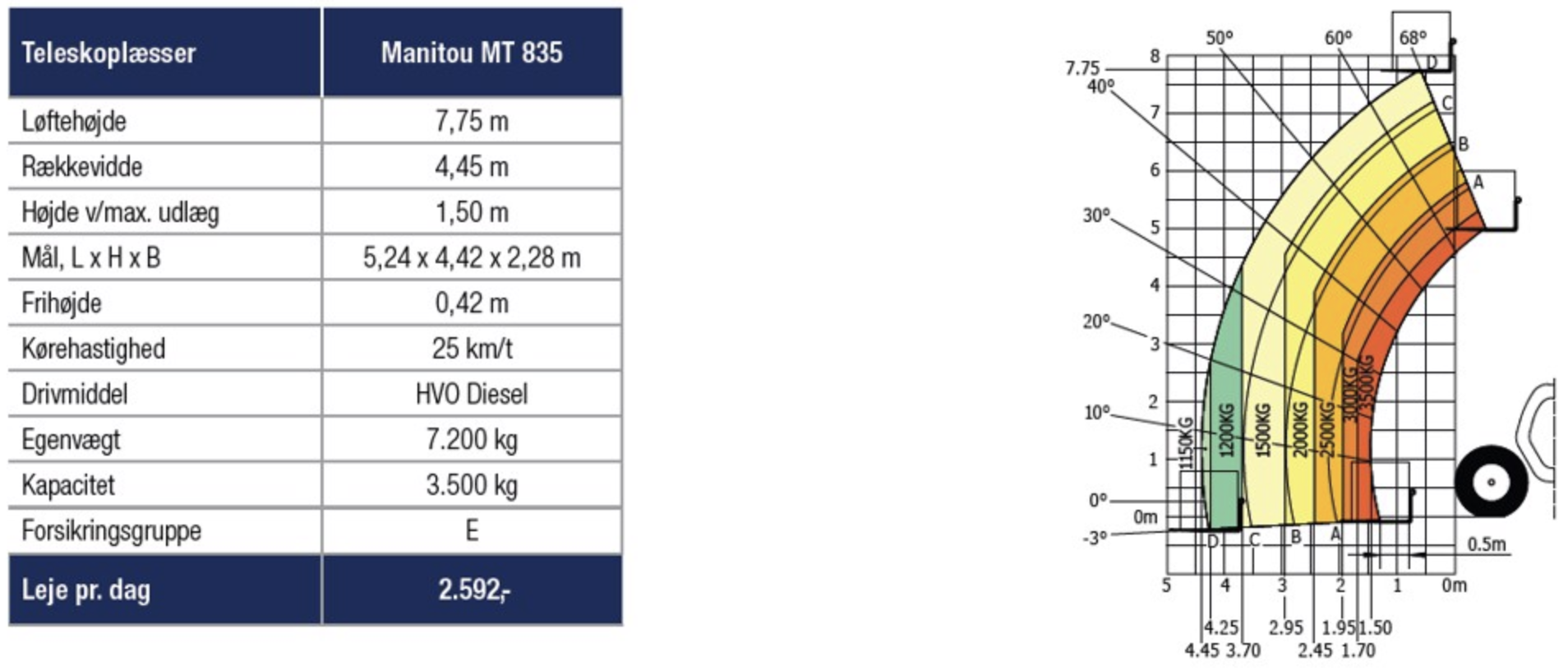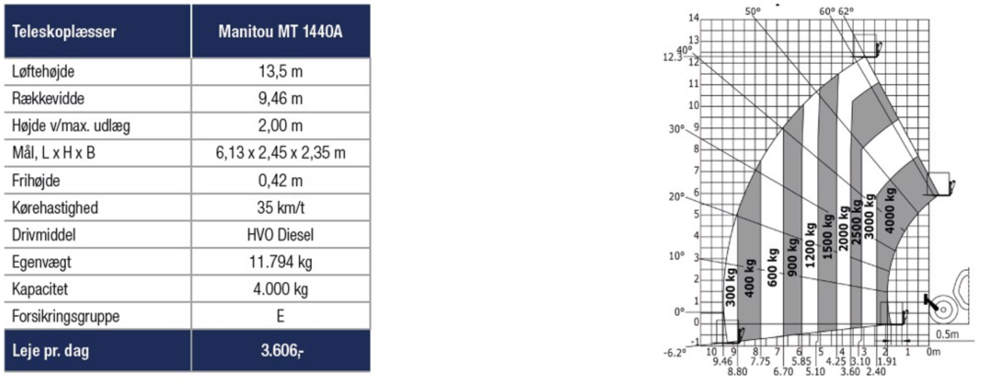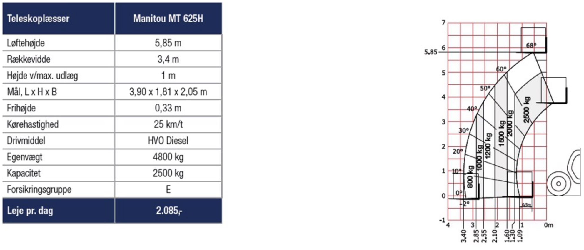 Teleskoplæsseren er større og mere kraftfuld end minilæsseren, og kan med sin teleskoparm forlænges både frem og op. Teleskoplæsseren kan løfte materialer flere meter op eller frem, alt efter dit behov. Vi udlejer teleskoplæssere med en løftehøjde mellem 4,16 m og 17,55 m, og rækkevidde mellem 2,29 m til 13,08 m. De største maskiner, som vi har, kan løfte op til 4.000 kg.