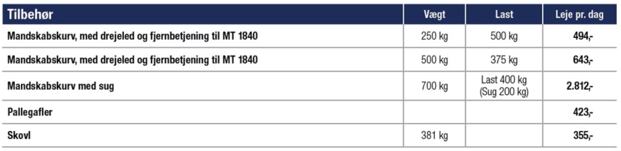 Her er det muligt at leje en mandskabskurv til teleskoplæsseren, hvis læsseren skal bruges til at komme til områder, der ellers kan være besværlige at nå. Er opgaven netop at flytte mandskab, har vi et stort udvalg af lifte, som er lavet til opgaven. Derudover kan du både leje pallegafler og skovl, hvis du i stedet har behov for at flytte materialer.